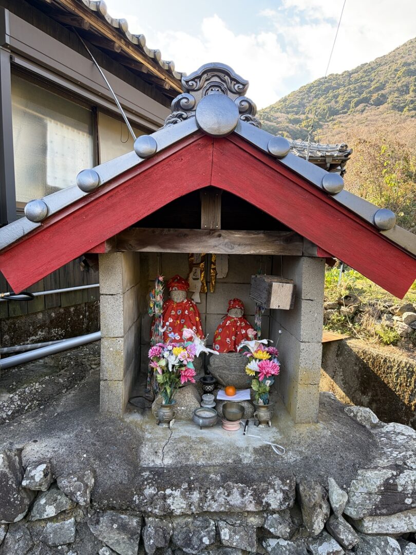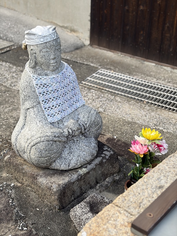 平郡のお地蔵さまはいつもかわいく着飾っておられるので、集落を歩くたびに気になっていました。島の方にお聞きしたところ、このお召し物をご準備されている方がいるとのこと。