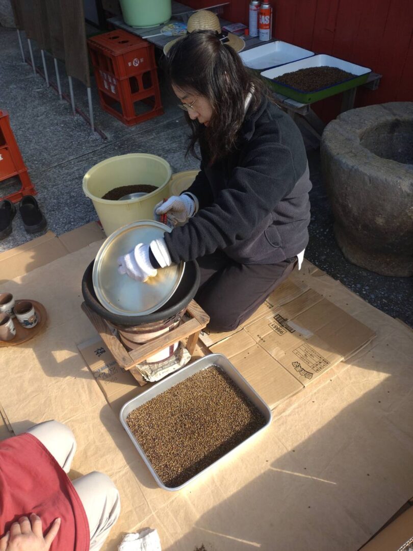 こちらが実際の豆茶製造の現場です。七輪の上にほうらく(ほうろく)という皿を置き、そこに豆を入れて煎っていきます。