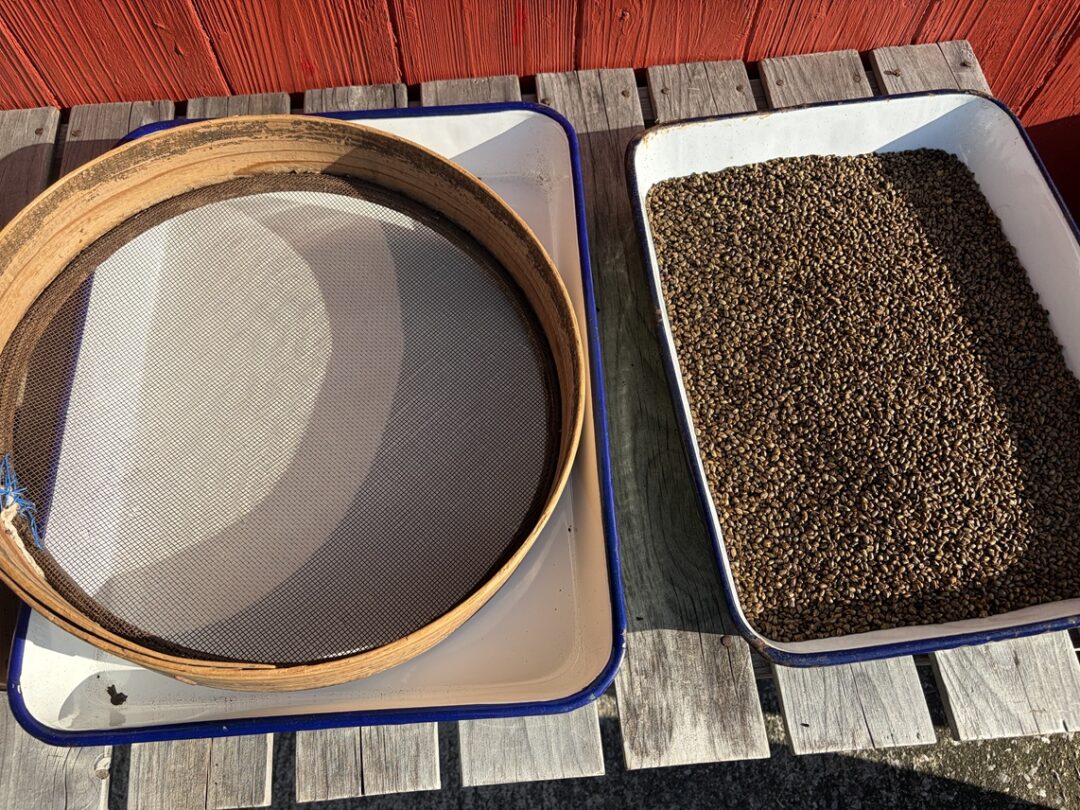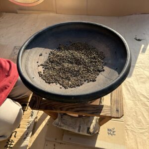 煎った豆をほうらく皿から平らな入れ物に移し、熱が取れたらざるで細かい粉をおとして完成です。
