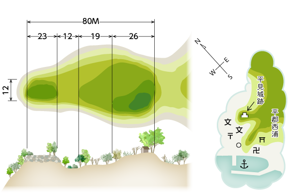 平郡西中学校グラウンドの裏山に平見山という標高七〇メートルほどの小山があるが、ここにはかつて城があった。古老の話では、明治頃には石仏が多く残っていたというし、現所有者である和田満氏がミカン畑にする際には、柱らしき古木が深く埋まっていたという。