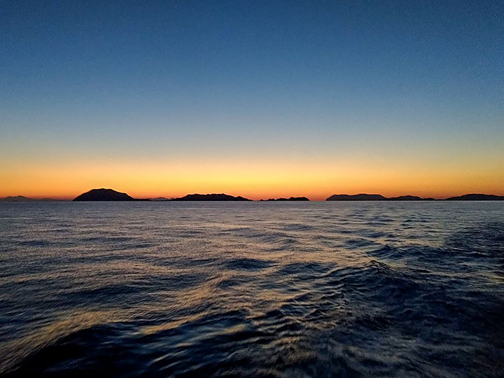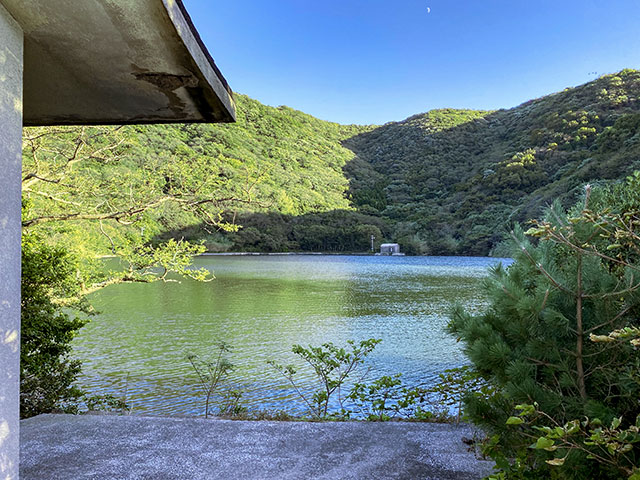 ひとまずすぐ上の皇座山に登った。皇座山の山頂には大蛇が住んでいたといわれる跡があり、今もなお一帯は草木も生えてない。山頂から見ると、すぐ目の前に緑豊かな美しい島が横たわっている。